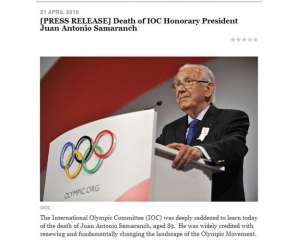 前國際奧委會主席薩馬蘭奇因心臟病去世...